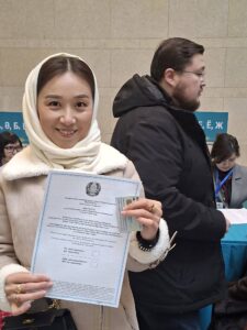 Am frühen Nachmittag wuchs die Anzahl der Wählerinnen und Wähler, welche das Wahllokal betraten. Um 14 Uhr Ortszeit betrug die Wahlbeteiligung 51,93 Prozent. Das Referendum galt somit als durchgeführt. Almas Zheksenbekow, ein Medienberater, gab seine Stimme in Begleitung seiner kleinen Tochter ab.“ Natürlich habe ich mit „Ja“ gestimmt“, erklärte der 38-jährige mit Nachdruck. „Ich habe kein Problem damit, dass dadurch die Stellung unseres Präsidenten gestärkt wird. Kasachstan braucht Stabilität, gerade angesichts der politischen Unruhen und Kriege überall!“ Die Aussage bezog sich auf die Tatsache, dass Präsident Kassym-Schomart Tokajew durch die neue Verfassung seine Macht stärken wird.