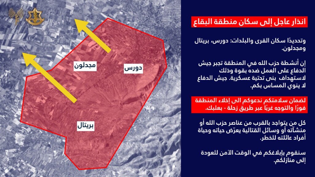 „Die Bewohner der Stadtteile Bourj el-Barajneh und Hadath bewegen sich auf der Straße von Beirut nach Damaskus in Richtung Osten zum Libanongebirge. Die Bewohner der Stadtteile Haret Hreik und Shiyyah bewegen sich auf der Straße von Beirut nach Tripolis in Richtung Norden nach Tripolis und über die Metn-Schnellstraße auch in Richtung Osten zum Libanongebirge. Rettet euer Leben und evakuiert sofort eure Häuser. Es ist verboten, sich nach Süden zu bewegen. Jede Bewegung nach Süden kann euer Leben gefährden. Wir werden euch benachrichtigen, wenn es sicher ist, in eure Häuser zurückzukehren.“ Die „Verteidigungsarmee“ wolle niemanden schaden, heißt es, die Aktivitäten der Hisbollah würden sie dazu nötigen, mit Gewalt gegen die militärische Infrastruktur vorzugehen. In dem Gebiet gibt es auch die fast vergessene UN-Mission UNIFIL. Sie äußerte Sorge über die erzwungene Evakuierung, die Bombardierungen und die militärischen Bewegungen der IDF im Libanon: „Diese verstoßen nicht nur gegen die Resolution 1701, sondern auch gegen die Souveränität und territoriale Integrität des Libanon.“